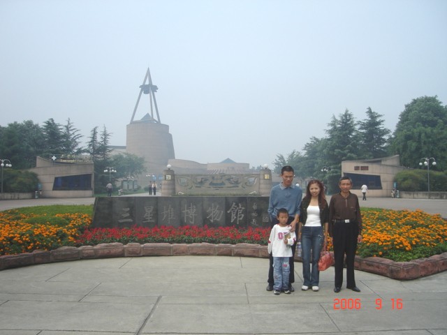第二天(9月16日)上午,赵忠文陪同我们参观位于城西约十公里的三星堆博物馆(公园)。这是我们此行的第一个名胜景点。三星堆,久闻其名。但过去对它知之甚少。这是近年来媒体报道的一个亮点。就是因为这里上世纪80年代后期有一系列重大的震惊世界的考古发现。在这个宽大的展馆中有在附近出土的大量玉器、金器、青铜人头像,其形制独特,举世无双。三星堆是一个“古城、古国、古文明”的遗址,是中国史前文明的一个灿烂的时代。它与古埃及、古罗马、古希腊、古印度相媲美,是人类文明同一季节盛开的鲜花。它的发现改写了中国历史,把中华民族5000年文明史又向前推进了1000多年,把中华文明发祥地在黄河的独家中心说,改写成长江上游同时有一个蜀文明中心。因此,在这里建了一座全国一流的博物馆和公园。这次的参观,让我们领略了几千年前人类的文明。那些出土的展品就是现代人都难以制造得那么精美。三星堆不愧是一个著名的旅游点,游人络绎不绝。