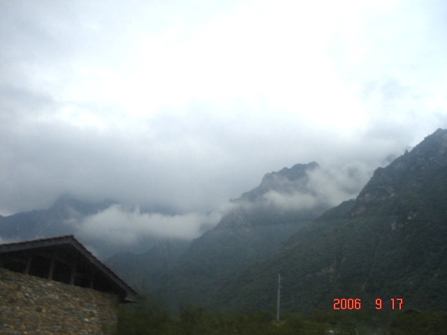 经过几个购物点后,到达川主寺已是十一点多。来时在此住过一晚,这次在此匆匆吃过午饭,便往黄龙。这是红军长征经过的地方,山上高高竖立着长征纪念碑。远处便是“更喜岷山千里雪,三军过后尽开颜”的岷山山脉。我们上的黄龙就是其中的一部分。